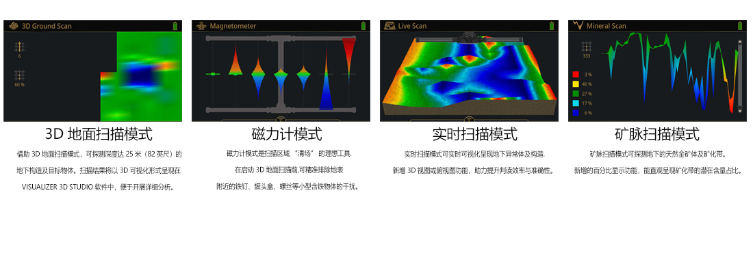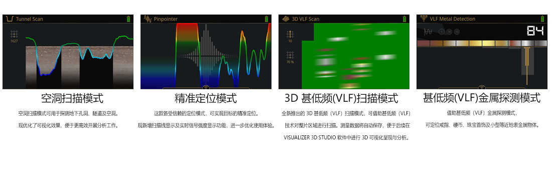 ·工作模式:3D 地面掃描、3D 甚低頻掃描、礦脈掃描、空洞掃描、實(shí)時(shí)掃描、磁力計(jì)模式、定位辨別模式、甚低頻金屬探測(cè)模式